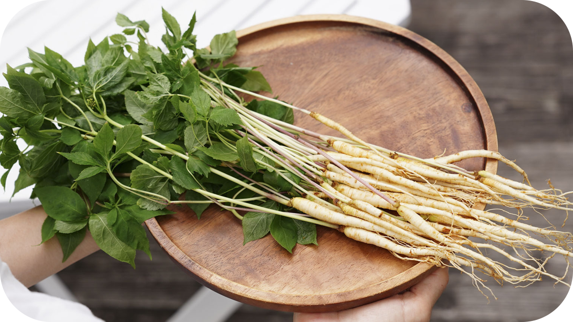 古来より朝鮮半島には不老長寿の山人参が生息しており、世界中の老若男女が追い求めてきた歴史があります。これまで高麗人参は根の太い多年生のものが栄養価が高いとされて来ましたが、近年、フレッシュな葉付きの生高麗人参(韓国内ではセッサクサムと呼ばれる)が出始め、この葉にこそ、人参特有の高い効能を持つ「ジンセノサイド」が多く含まれることもわかってきました。