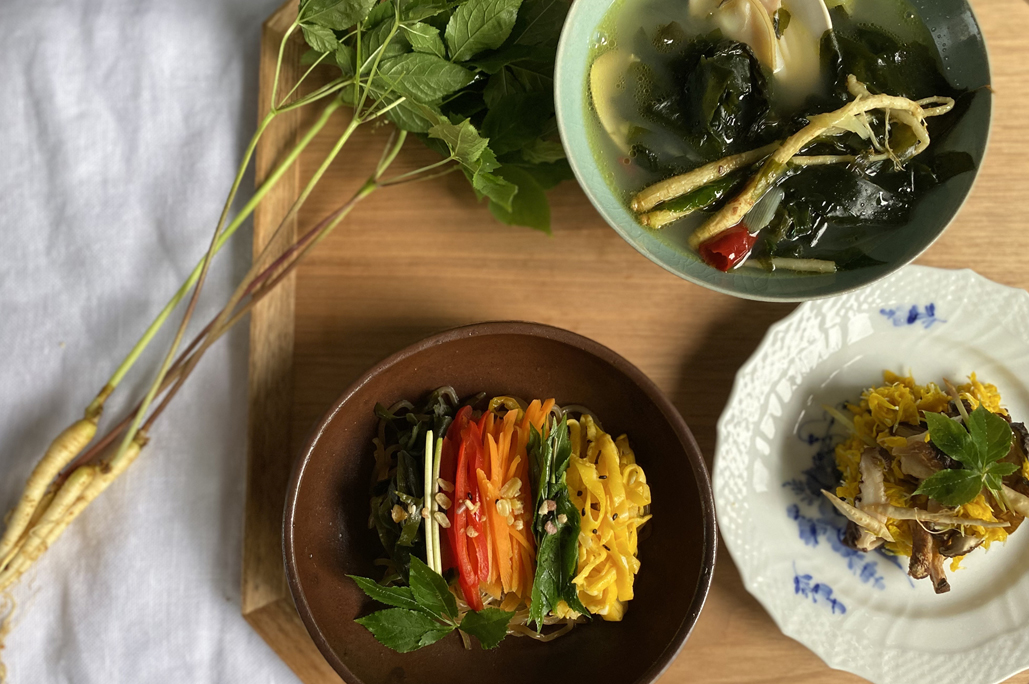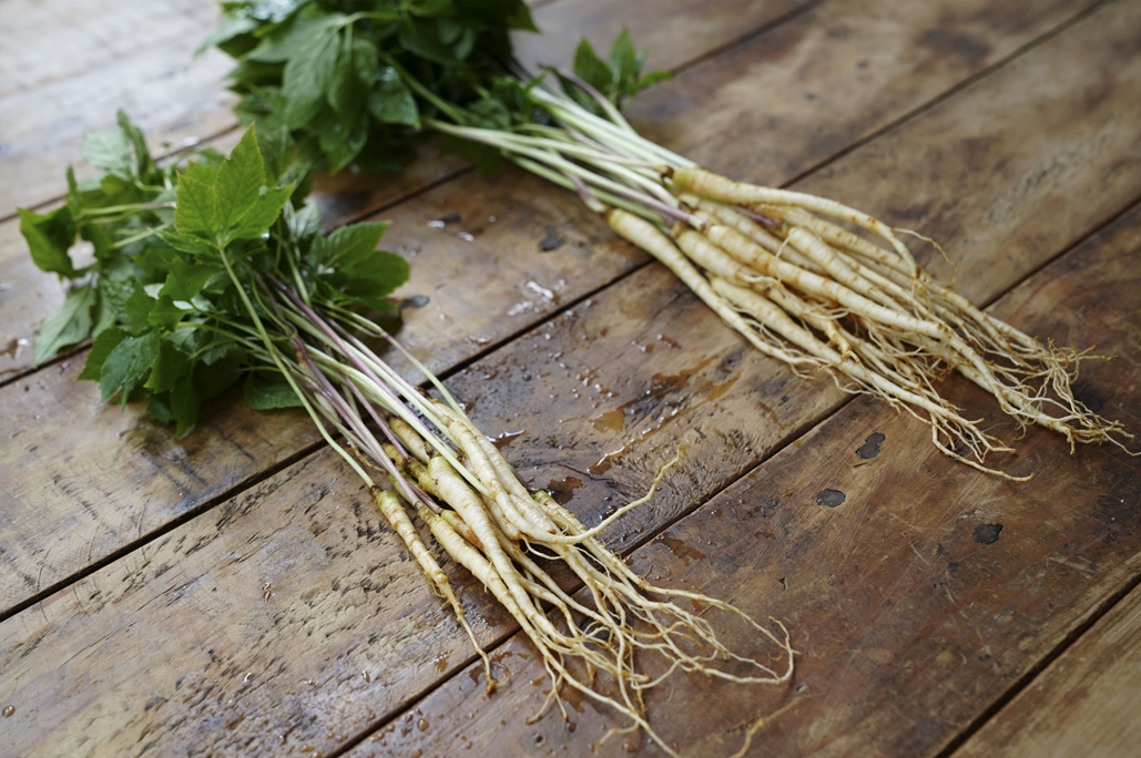 フレッシュな高麗人参をまずは、そのまま噛んでみてください。みずみずしく、若く柔らかいので野菜のように生でいただくことができます。珍しい葉も一緒に口にすると、ほろ苦くさっぱりとします。加熱するとホクホクとして、甘味が増すのでスープや炒め物、蒸しものなどにも最適です。