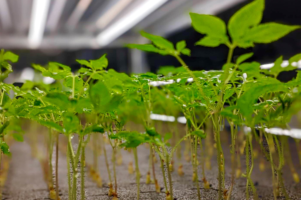 香川県三豊市高瀬町は県を代表する茶の産地。豊かな自然と地下水に恵まれたこの地でフレッシュ高麗人参は育てられています。一度に2000本を植えられる日本最大規模の施設で、太陽光の波長に設定したLEDライト、ミスト式水耕栽培プラントなどを設置。温度と湿度を管理し、病害虫対策にも対応した最適な環境を保つことで、栄養価の高い高麗人参を安定的に栽培・収穫しています。